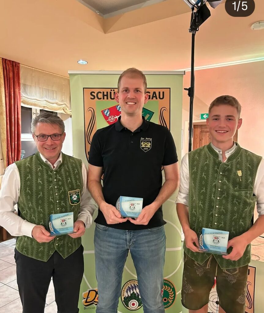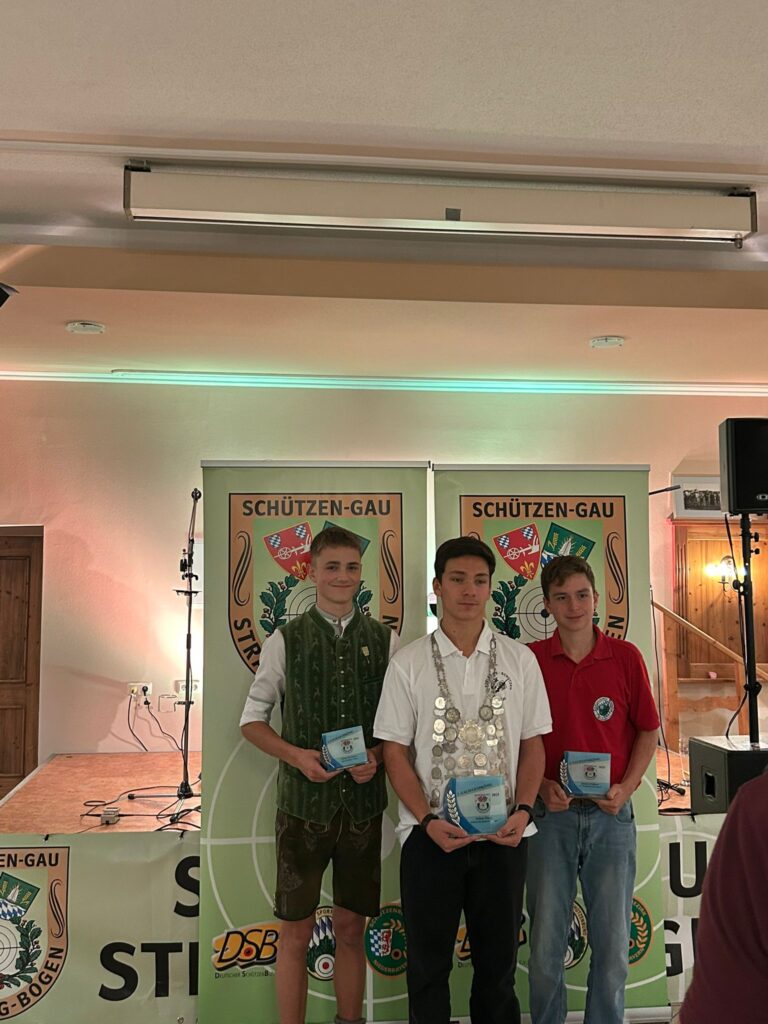 Neuer Gaujugendkönig mit einem 23,8-Teilerwurde Kilian Plank mit der Luftpistole von den Edelweißschützen Perkam, gefolgt von Hubert Zellmer (28,4-Teiler, SV Waldeslust Kirchroth) und Niklas Hornauer (36,3-Teiler, Sportschützen Atting).