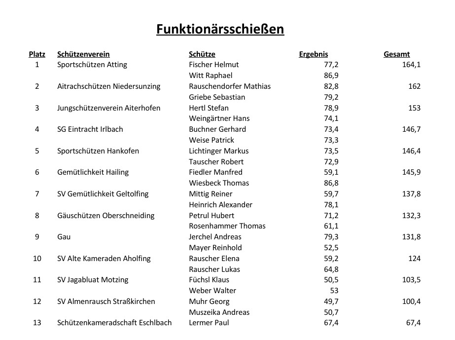 Unter den 13 teilnehmenden Vereinen setzte sich das Team der Sportschützen Atting mit Helmut Fischer und Raphael Witt beim beliebten Funktionärsschießen durch und sicherte sich den Sieg. Den zweiten Platz belegten die Aitrachschützen Sunzing-Leiblfing mit Mathias Rauschendorfer und Sebastian Griebe, gefolgt von den Jungschützen Aiterhofen mit Hans Weingärtner und Stefan Hertl auf Rang drei. Alle Gewinner durften sich über tolle Sachpreise freuen.