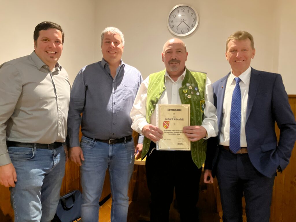 So wurde der 1 Schützenmeister Helmut Fischer für 29 Jahre in verschiedenen Positionen, Schriftführerin Rita Stadler für 30 Jahre und der 2 Schützenmeister Gerhard Nedoschill in verschiedenen Positionen für 13 Jahre Ehrenamt im Verein geehrt.